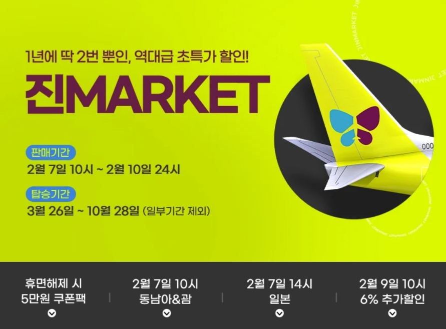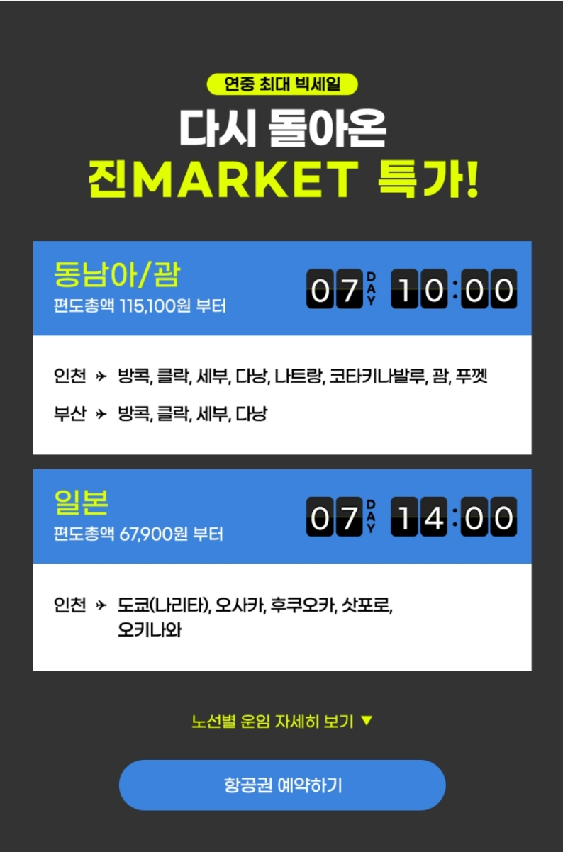 진에어 특가 일명 진마켓으로 불리는 항공권 특가 이벤트는 오늘 7일 오전 10시부터 예약을 진행한다. 10일 24시까지만 판매를 진행하니 혹여 남는 티켓이라도 구하고자 한다면 매시간 매순간 홈페이지를 들락날락 해야 할듯 싶다.